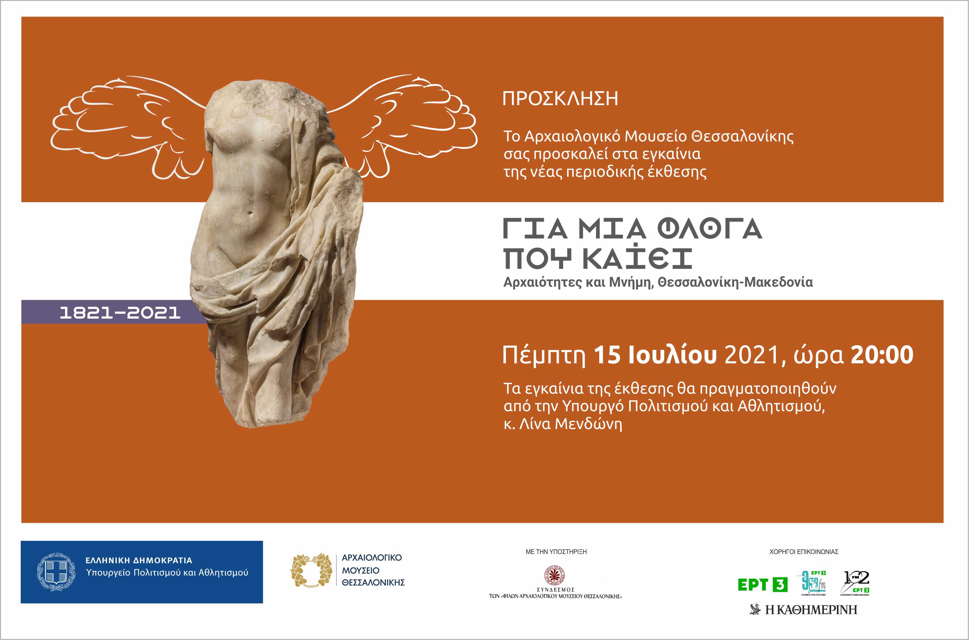 Το Αρχαιολογικό Μουσείο Θεσσαλονίκης εγκαινιάζει στις 15 Ιουλίου 2021, στις 20.30 την έκθεση με τίτλο, "Για μια φλόγα που καίει. Αρχαιότητες και Μνήμη, Θεσσαλονίκη – Μακεδονία [1821-2021]".
