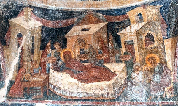 Η Γέννηση της Θεοτόκου, τοιχογραφία, β΄ μισό 14ου αι., νοτιοανατολικό παρεκκλήσι,